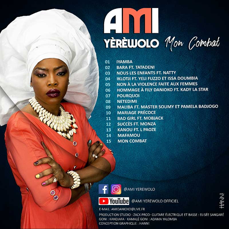 AMI YÈRÈWOLO dévoile son tout nouvel album MON COMBAT, composé de 15 morceaux, dont 8 featurings : TATADENI, NATTY, YELI FUZZO, ISSA DOUMBIA, KADY LA STAR, MASTER SOUMY, PAMELA BADJOGO, ZEUS MOBJACK, MONZA et L PAOZÉ, entièrement produits par ZACK PRODUCTIONS.