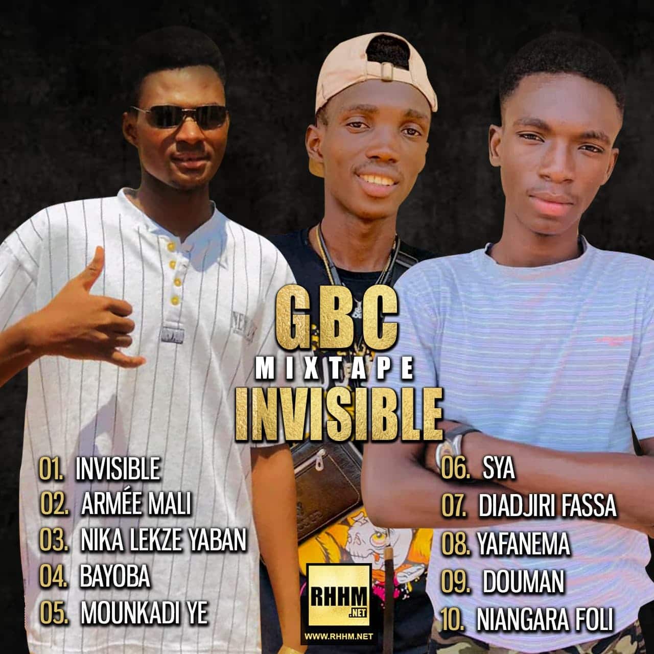 GBC - INVISIBLE (Mixtape 2021) - Couverture Couverture avant | Couverture arrière GBC présente sa toute nouvelle mixtape INVISIBLE, composée de 10 morceaux, dont 2 featurings, avec MGF et EVA, entièrement produits par FRANÇAIS et FAT MONSTER, année 2021, musique Mali. 1. GBC - INVISIBLE 2. GBC - ARMÉE MALI 3. GBC - NIKA LEKZE YABAN 4. GBC - BAYOBA 5. GBC - MOUNKADI YE 6. GBC - SYA 7. GBC Ft. MGF - DIADJIRI FASSA 8. GBC - Ft. EVA - YAFANEMA 9. GBC - DOUMAN 10. GBC - NIANGARA FOLI